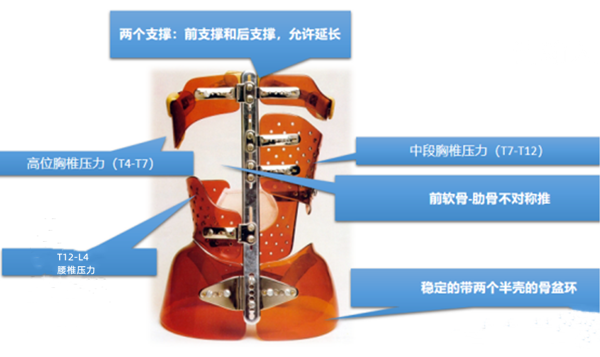 Lyon(里昂)矯形器有前后支撐桿,并可以延長,在胸段、腰段都有可調(diào)節(jié)的壓力,并在前側(cè)肋骨給予不對稱的推力,在骨盆處有兩個半殼對骨盆進行穩(wěn)定。這是LYON方法中知名度最高,最具代表性的一款矯形器。